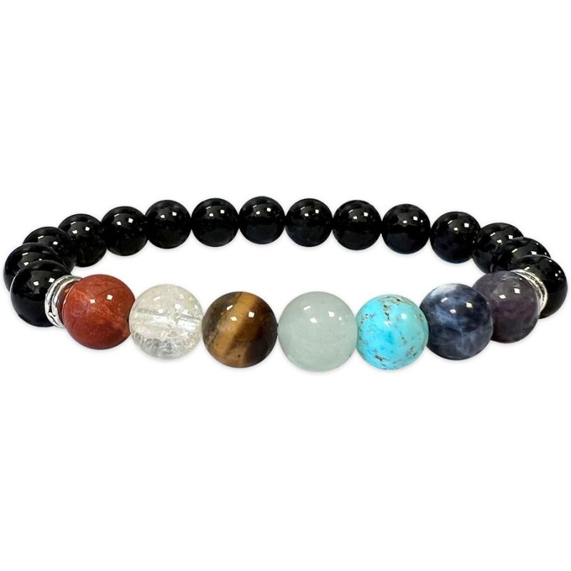 Ce bracelet est composé de perles d'onyx, ainsi que sept perles de pierres différentes de 8 mm chacune, représentant les sept chakras principaux du corps. Le choix des pierres dans ce bracelet est particulièrement intéressant pour la lithothérapie, car chacune des pierres a des propriétés spécifiques qui correspondent aux chakras correspondants.